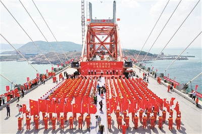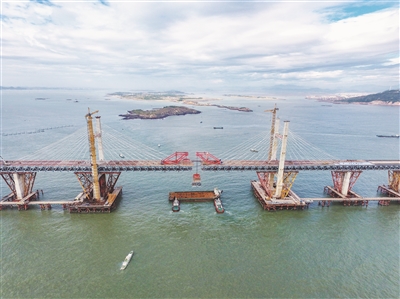 平潭海峽公鐵兩用大橋最后的合龍段位于鼓嶼門(mén)航道橋。平潭海峽公鐵兩用大橋全長(zhǎng)16.34公里,起于福建省福州市長(zhǎng)樂(lè)區(qū)松下鎮(zhèn),經(jīng)人嶼島、長(zhǎng)嶼島、小練島、大練島,依次跨越元洪航道、鼓嶼門(mén)水道、大小練島水道、北東口水道。大橋共設(shè)有元洪航道、鼓嶼門(mén)水道和大小練島水道等3座雙塔斜拉航道橋。
