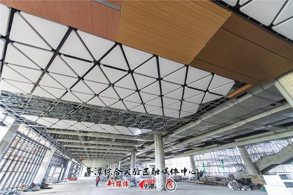 5日上午,記者首先來到福平鐵路平潭站一樓的候車廳內,只見,偌大的候車廳按照施工進度的先后,被自然地分成幾個區域。在候車廳的正中間位置,候車廳的吊頂用一塊塊白色的三角形鋁板拼接起來,白色鋁板吊頂的中間,搭配著褐色的木紋鋁板,整體風格顯得清新簡約,時尚大氣,這就是未來候車廳的吊頂樣板。