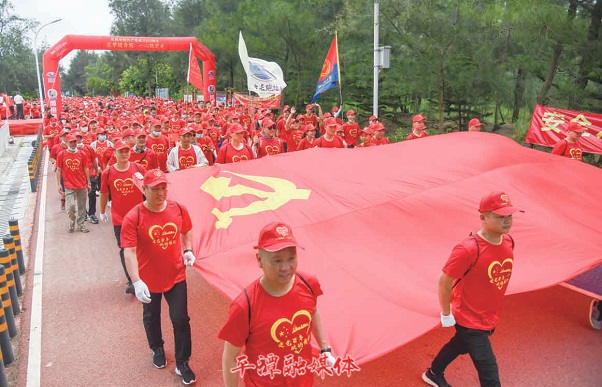 健步走活動(dòng)中,參與者跟著黨旗前進(jìn)