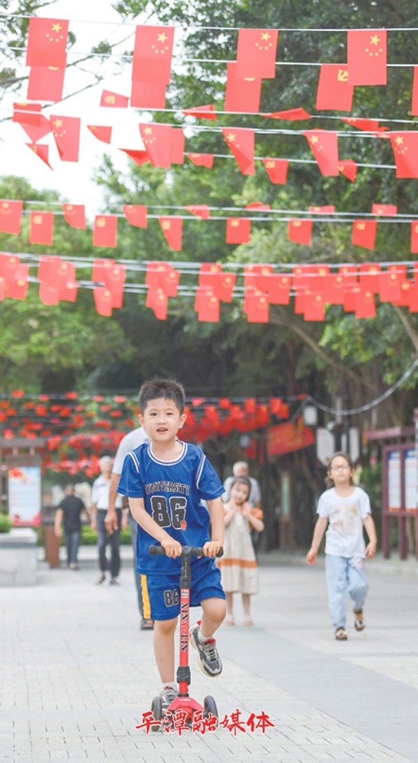 小朋友在掛滿國旗和黨旗的公園玩耍