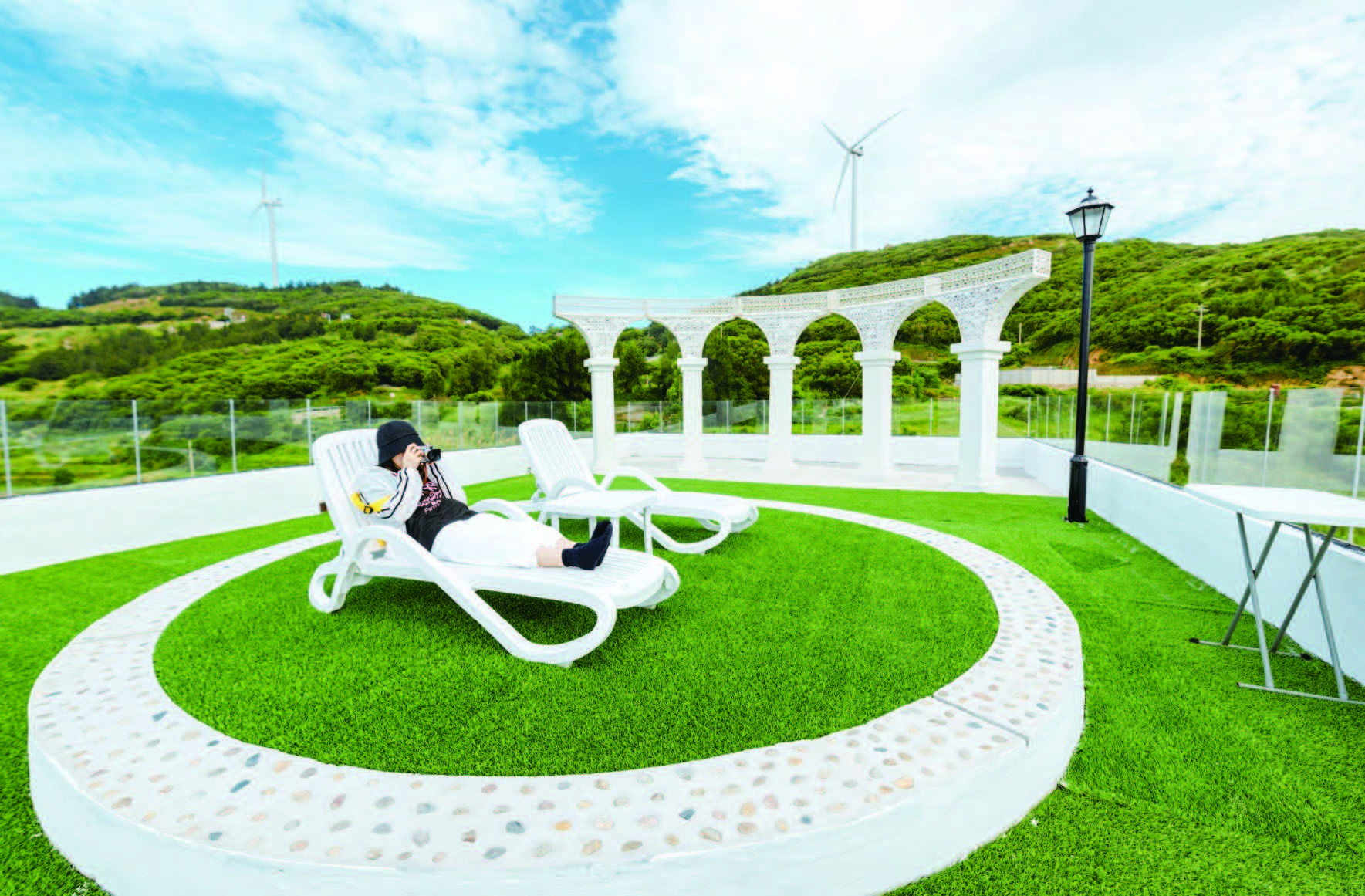南盤仙境海邊藝術民宿與南盤村村部比鄰而居,卻不顯喧囂,有鬧中取靜的美感。民宿是通棟建筑,共三層,每間房都別具特色,尤其是風景獨絕的海景房。放眼望去,嵐島北部海隅,星星點點島嶼,盡收眼底。可以看風車搖擺,觀南盤塔姿態,聽濤聲依舊,置身其中,宛若仙境,妙不可言。“慕名而來,到這之后,發現這里真的很美。”來自廣東省的游客段先生探出窗外看著眼前的風光興奮地說。
