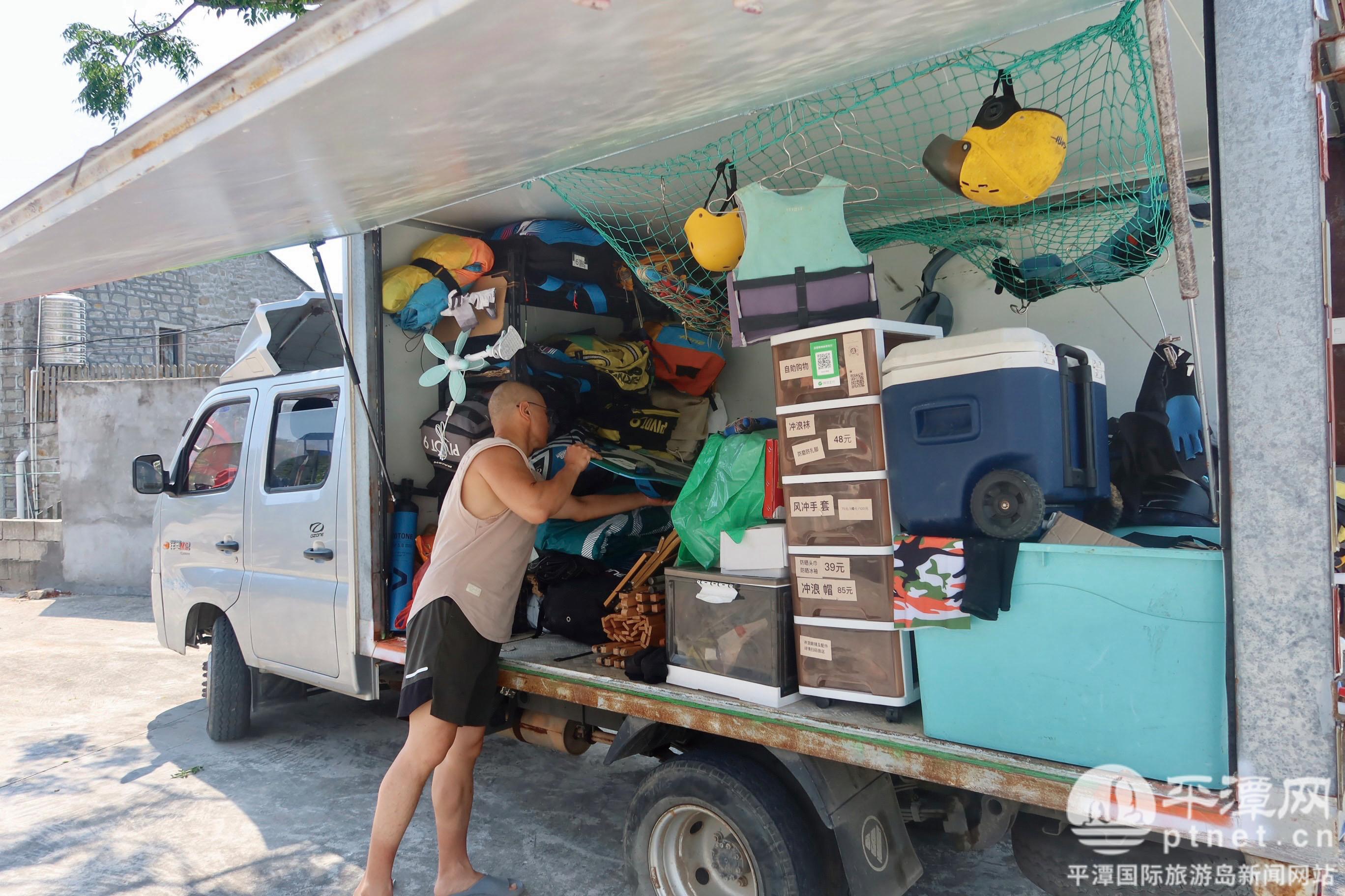 丁勇在整理風箏沖浪設備