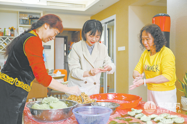 食過艾草,方知春之味。艾草是春天的禮物,也是餐桌上的佳肴。近日,在金井片區如意社區,市民陳桂枝正和鄰居用艾草制作美味的青團。“將新鮮的艾草洗干凈后搗碎蒸熟,加入食用油、鹽、糯米粉和粘米粉等攪拌均勻,揉搓成面團,青團面坯就制作完成了。”陳桂枝一邊說著,一邊熟練地將面團揉成條塊狀,再搟壓成小巧的圓餅,一張張色澤鮮亮、光滑柔軟的青團“外衣”準備就緒。
