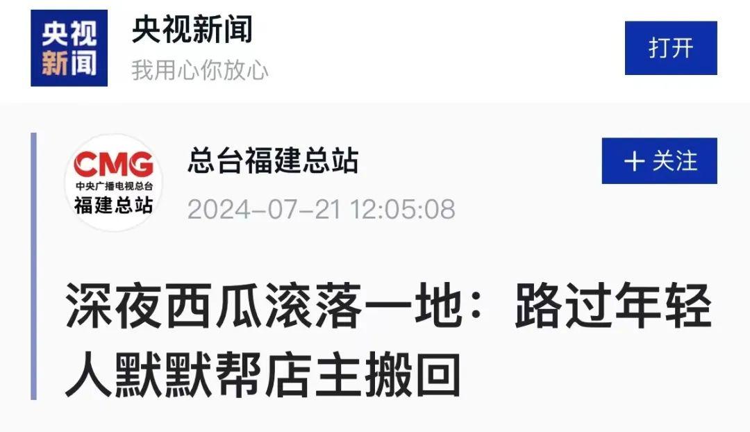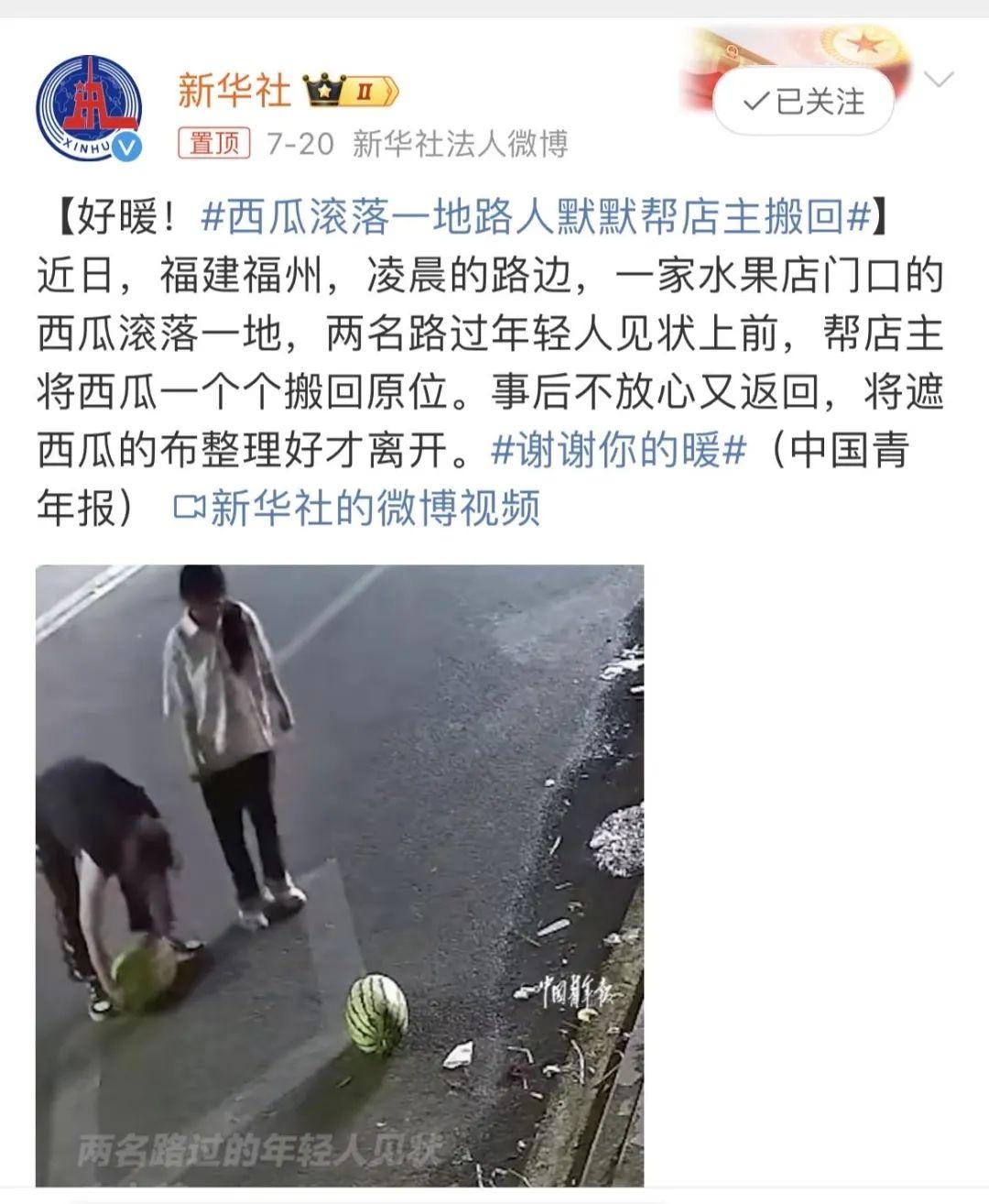 事情要從17日說起。當日凌晨,平潭一家水果店門口的西瓜滾落一地,兩名路過的年輕人見狀,立即上前將西瓜一個個搬回原位。隨后,他們又留意到有幾顆西瓜仍暴露在路邊,就細心地將遮西瓜的布重新整理好,便默默離開。