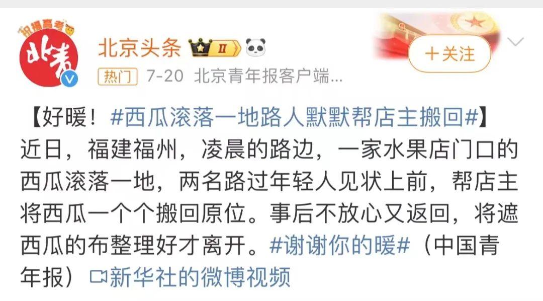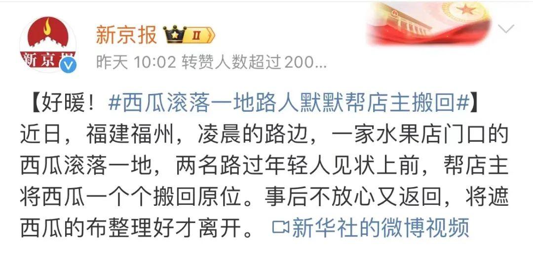 17日上午9時許,水果店店主閆先生到店時看到西瓜掉落一地,趕忙查看監控錄像了解情況。監控畫面顯示,由于盛放西瓜的籃筐承受不住重量發生破損,導致西瓜掉落滾到馬路邊。“在監控中看到這兩個年輕人幫忙撿西瓜,當時內心十分觸動,覺得很暖心,社會需要這樣的正能量。所以我發布了視頻尋找他們,希望能找到并感謝他們。”閆先生說。