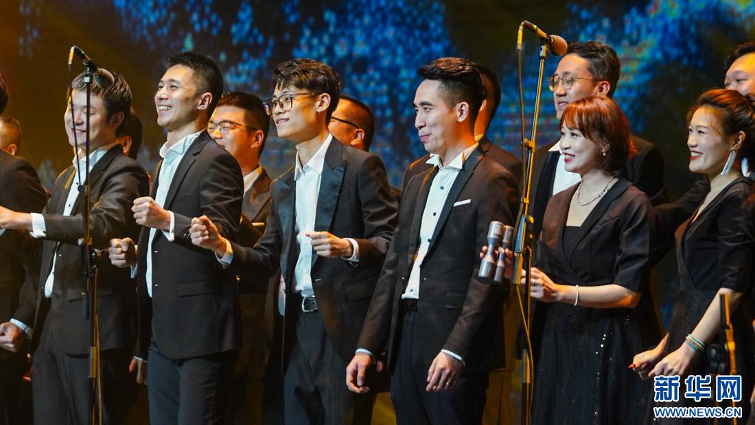 當(dāng)晚參加演出的阿卡貝拉人聲團(tuán)及合唱團(tuán)歌手一起演唱歌曲《海洋之心》。新華網(wǎng) 肖和勇 攝