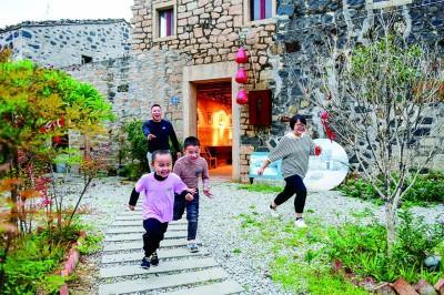 在平潭上樓村“樓臺會”,臺胞傅韜丞(后)和村里的孩子玩游戲。資料圖片