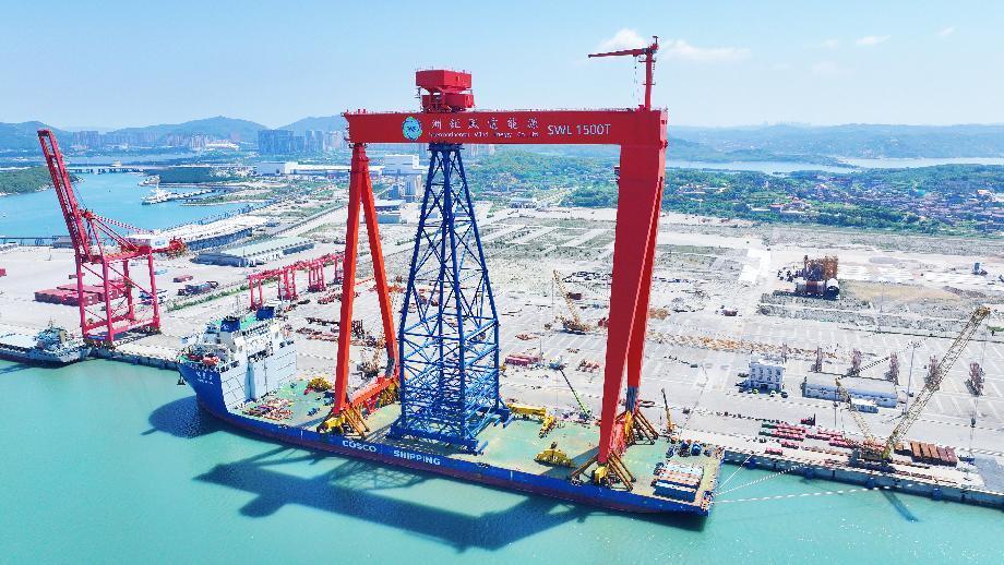 5月14日,超大型龍門架配件在平潭港完成轉運,將由利比里亞籍船舶“祥泰口”運往中國臺灣高雄港。(白志斌 攝)