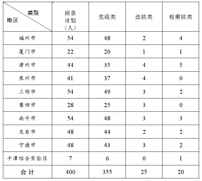 (一)計劃從福建省內外〔不含國(境)外,下同〕部分高校福建生源2026年全日制應屆碩士、本科優秀畢業生中,選拔選調生400名,其中:黨政類355名、法院類25名、檢察院類20名。