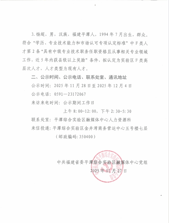 中共福建省委平潭綜合實驗區融媒體中心黨組關于認定實驗區高層次人才的公示