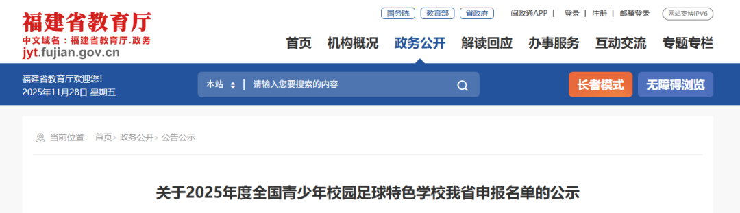 根據(jù)《福建省教育廳辦公室關(guān)于開展2025年度全國(guó)青少年校園足球特色學(xué)校申報(bào)工作的通知》(閩教便函〔2025〕1200號(hào)),經(jīng)各校自主申報(bào)、各設(shè)區(qū)市教育局(含平潭)審核推薦,全省158所中小學(xué)申報(bào)2025年度全國(guó)青少年足球特色學(xué)校,現(xiàn)將名單予以公示。