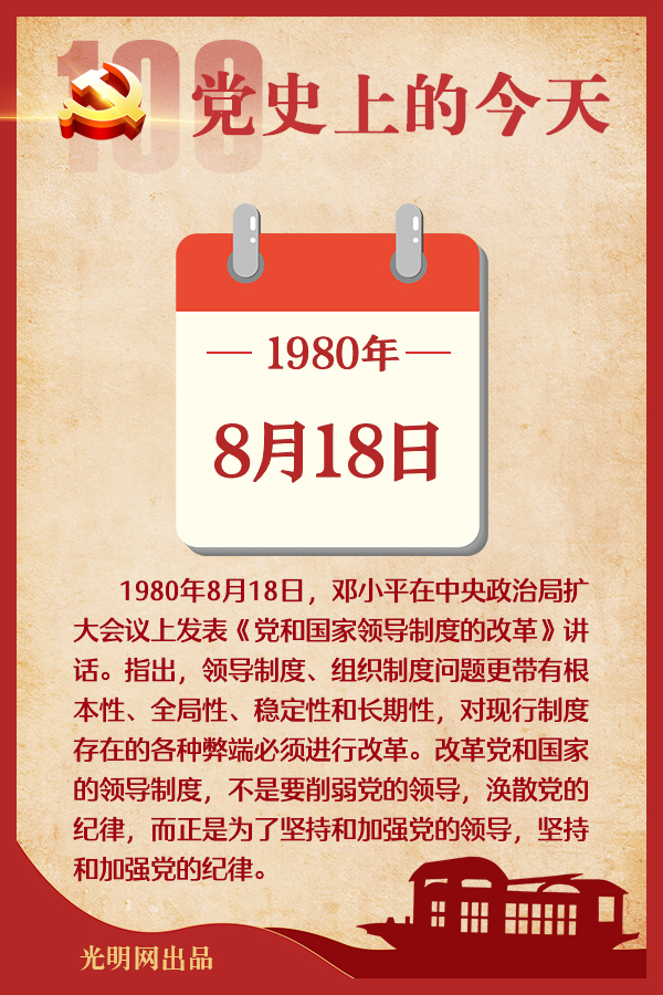 8月18日 鄧小平在中央政治局擴大會議上發表《黨和國家領導制度的改革》講話。指出,領導制度、組織制度問題更帶有根本性、全局性、穩定性和長期性,對現行制度存在的各種弊端必須進行改革。改革黨和國家的領導制度,不是要削弱黨的領導,渙散黨的紀律,而正是為了堅持和加強黨的領導,堅持和加強黨的紀律。