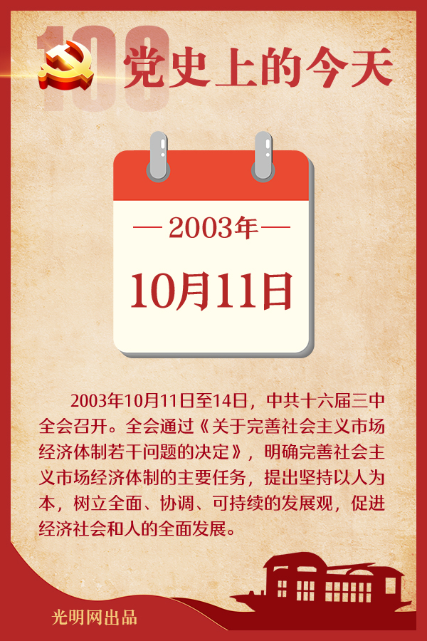 10月11日-14日 中共十六屆三中全會召開。全會通過《關于完善社會主義市場經濟體制若干問題的決定》,明確完善社會主義市場經濟體制的主要任務,提出堅持以人為本,樹立全面、協調、可持續的發展觀,促進經濟社會和人的全面發展。