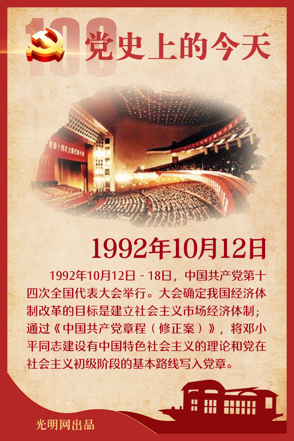 10月12日-18日 中國共產黨第十四次全國代表大會舉行。大會通過的報告《加快改革開放和現代化建設步伐,奪取有中國特色社會主義事業的更大勝利》,總結黨的十一屆三中全會以來14年的實踐經驗,決定抓住機遇,加快發展;確定我國經濟體制改革的目標是建立社會主義市場經濟體制;提出用鄧小平同志建設有中國特色社會主義的理論武裝全黨。大會通過《中國共產黨章程(修正案)》,將鄧小平同志建設有中國特色社會主義的理論和黨在社會主義初級階段的基本路線寫入黨章。