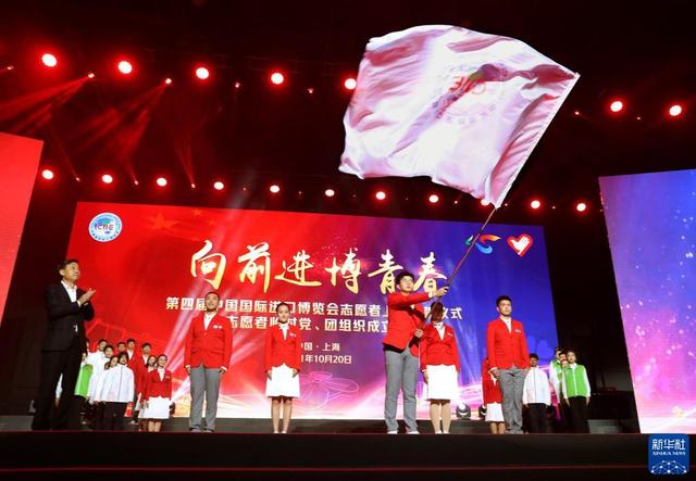 10月20日,志愿者代表在儀式現(xiàn)場揮舞第四屆進(jìn)博會志愿者總隊(duì)隊(duì)旗。