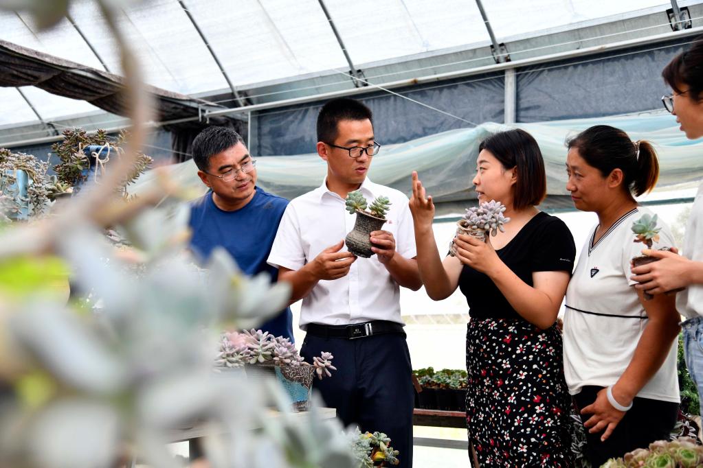 2020年6月9日,在濟南市章丘區三澗溪村農業創業園,青年創業黨支部書記王元虎(左二)和青年黨員一起商量發展事宜。