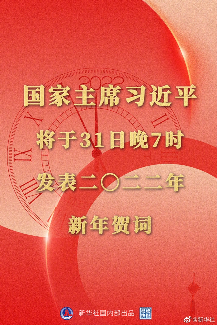 2021-12-30 10:22:03 來源:新華網原標題:國家主席習近平將發表二〇二二年新年賀詞