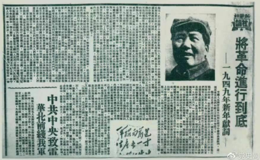 新華社發表毛澤東撰寫的一九四九年新年獻詞《將革命進行到底》。文章根據中國人民將要在偉大的解放戰爭中獲得最后勝利的情況,指出:敵人是不會自行消滅的,不會自行退出歷史舞臺的,我們必須用革命的方法,堅決徹底干凈全部地消滅一切反動勢力,不動搖地堅持打倒帝國主義,打倒封建主義,打倒官僚資本主義,在全國范圍內推翻國民黨的反動統治,在全國范圍內建立無產階級領導的以工農聯盟為主體的人民民主專政的共和國。使中華民族來一個大翻身,由半殖民地變為真正的獨立國,使中國人民來一個大解放,將自己頭上的封建的壓迫和官僚資本(即中國的壟斷資本)的壓迫一起掀掉,并由此造成統一的民主的和平局面,造成由農業國變為工業國的先決條件,造成由人剝削人的社會向著社會主義社會發展的可能性。文章宣布:一九四九年中國人民解放軍將向長江以南進軍,將要召集以完成人民革命任務為目標的政治協商會議,宣告中華人民共和國的成立,并組成共和國的中央政府。這篇文章收入《毛澤東選集》第四卷。