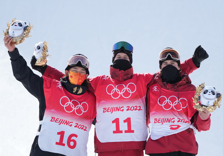 2月7日,獲得冠軍的加拿大選手馬克斯·帕羅特(中),獲得亞軍的中國選手蘇翊鳴(左)和獲得季軍的加拿大選手馬克·麥克莫里斯在頒發(fā)紀(jì)念品儀式上。新華社記者 楊世堯攝