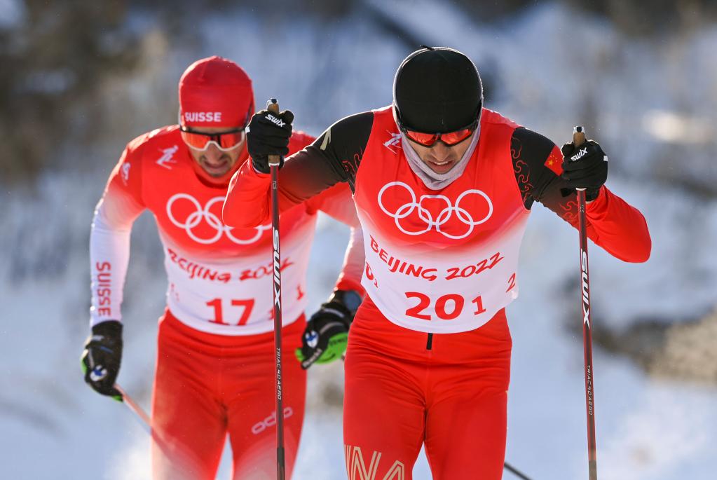 2月16日,中國隊(duì)選手王強(qiáng)(前)在北京冬奧會越野滑雪男子團(tuán)體短距離(傳統(tǒng)技術(shù))比賽半決賽中。新華社記者胡虎虎攝