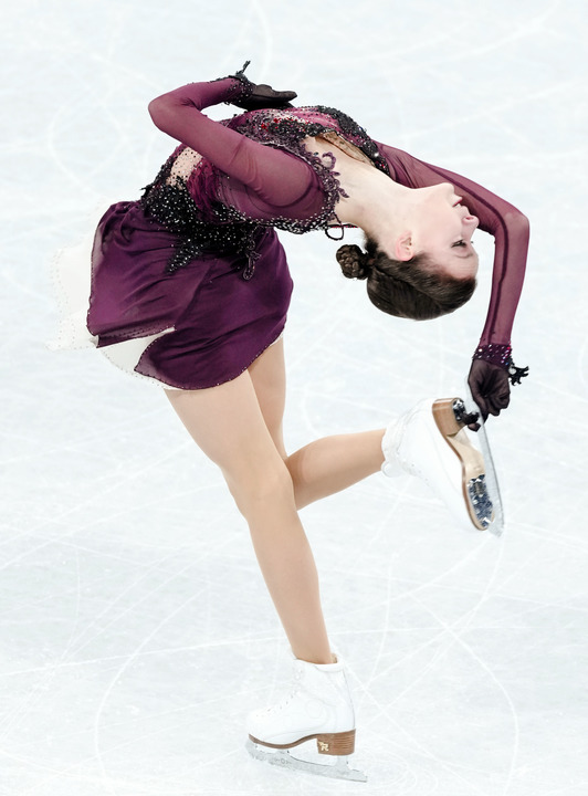 一席黑裙的特魯索娃倒數(shù)第四個出場,她成為第一位在冬奧會中完成五個四周跳的女選手,盡管有兩個四周跳完成得并不完美。最終,特魯索娃依靠這套技驚四座的表演獲得177.13分,并以251.73分的總成績獲得銀牌。