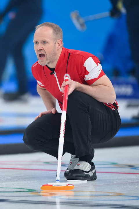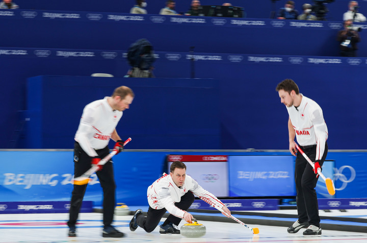 2月17日,加拿大隊選手布拉德·古休(中)在北京2022年冬奧會男子冰壺半決賽中。新華社記者王婧嬙攝