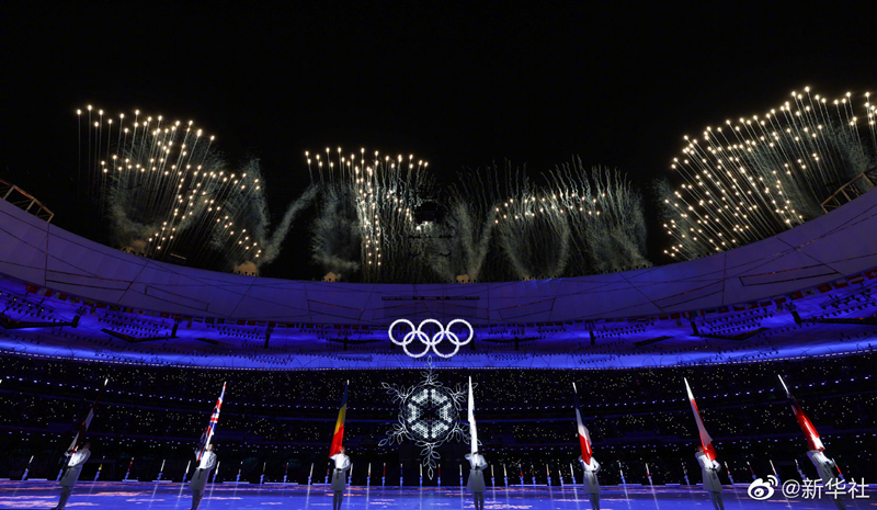 在純潔空靈的《雪花》歌聲中,主火炬“大雪花”緩緩落下,奧運之火漸漸熄滅。五環焰火再次升起,以此與2008年奧運會的同樣五環煙花相呼應,體現雙奧記憶。鳥巢上空用煙花打出“天下一家”和“ONE WORLD ONE FAMILY”中英文字樣,象征“世界大同,天下一家”的主題表達和“更團結”的奧林匹克精神,為本屆冬奧會畫上一個成功圓滿的句號。