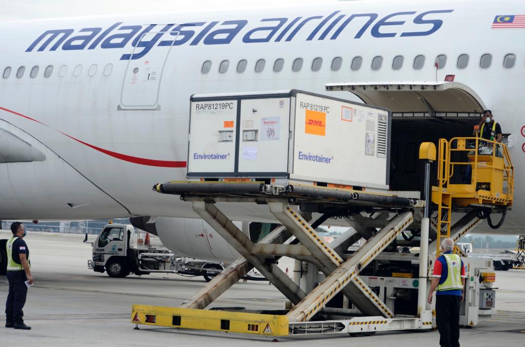 2021年8月20日,首批中國康希諾新冠疫苗運抵馬來西亞吉隆坡國際機場。(新華社發,馬來西亞科學、工藝和創新部供圖)