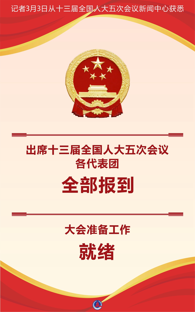 新華社北京3月3日電 記者3日從十三屆全國人大五次會議新聞中心獲悉,出席此次會議的各代表團已全部報到,大會各項準備工作已經就緒。