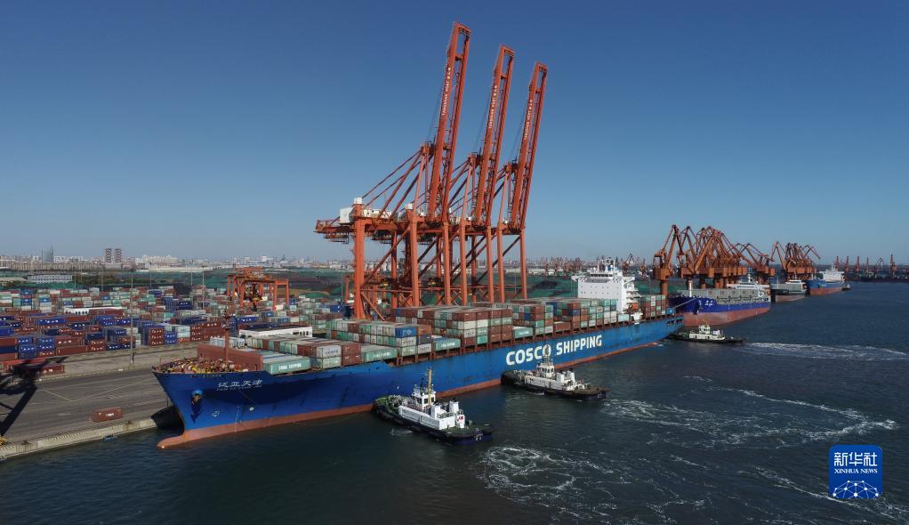 一艘輪船在拖輪的協(xié)助下向唐山港京唐港區(qū)集裝箱碼頭靠泊(2021年10月23日攝,無(wú)人機(jī)照片)。新華社記者 朱旭東 攝