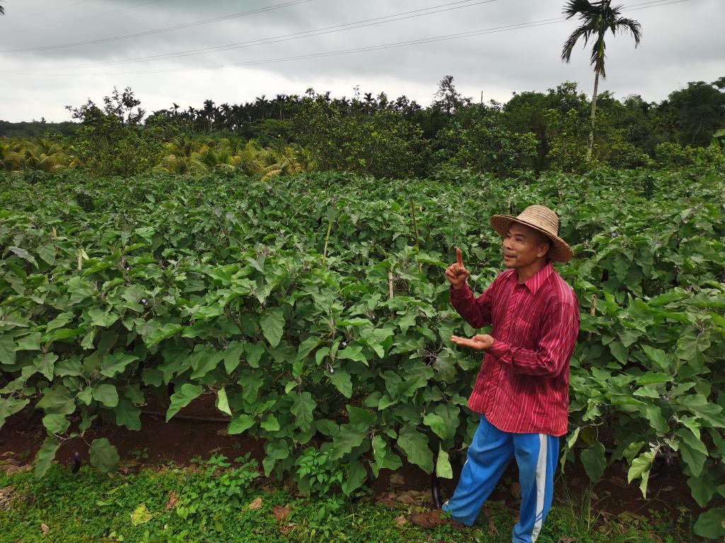 海口市瓊山區(qū)道崇村村民王統(tǒng)奮在介紹他種植茄子的秘訣。新華社記者趙葉蘋攝