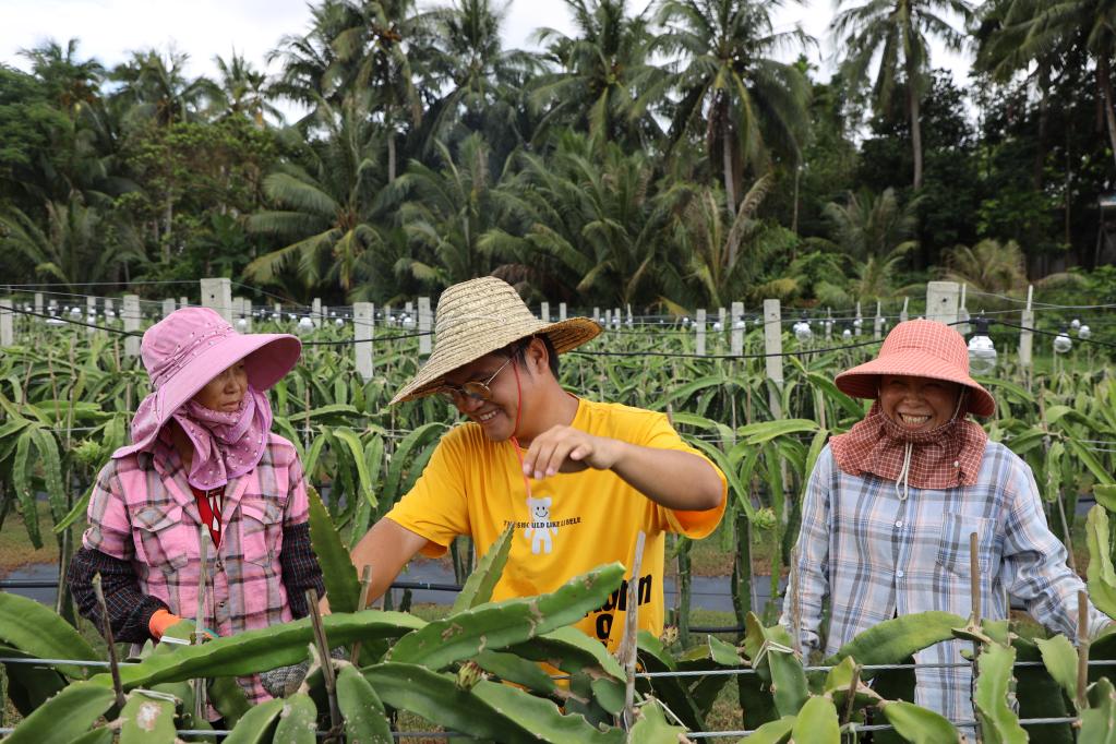萬(wàn)寧市長(zhǎng)豐鎮(zhèn)七甲村村民在火龍果基地修剪枝條。新華社記者房寬攝