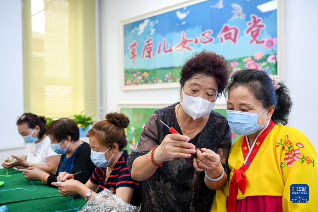 內蒙古赤峰市興安街道臨潢家園社區居民柳桂俠(右二)為民族技藝傳承班的學員講解編織技巧(2021年8月31日攝)。新華社記者 貝赫 攝