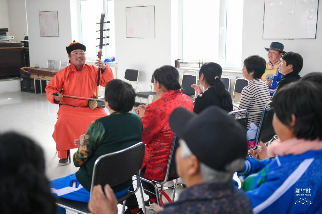 內蒙古興安盟科爾沁右翼中旗巴彥敖包嘎查的蒙古族村民在鄉村文化活動室表演蒙古族藝術烏力格爾(2019年4月17日攝)。新華社記者 彭源 攝