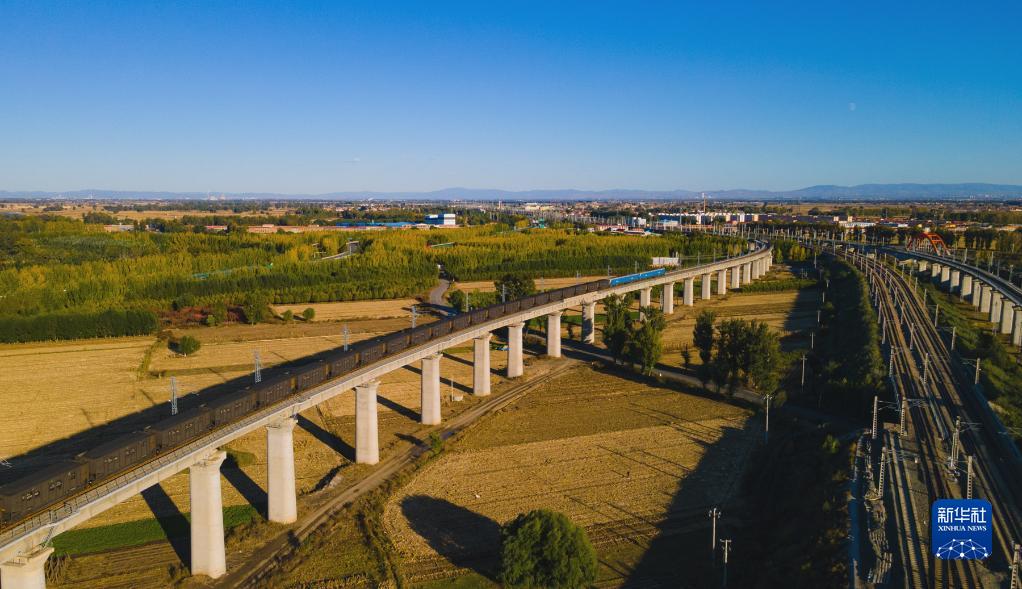 這是在內蒙古呼和浩特拍攝的運煤專列(2021年10月15日攝,無人機照片)。新華社發(夏亮 攝)