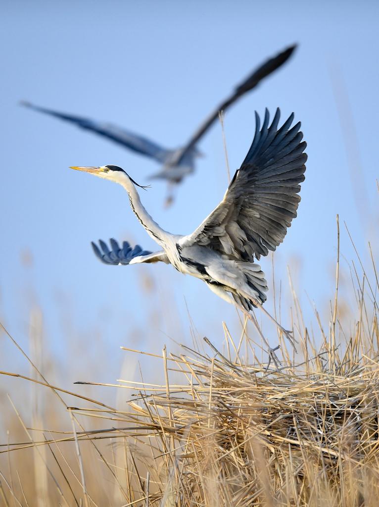 4月1日,蒼鷺在沙湖景區棲息、飛翔。新華社記者馮開華攝