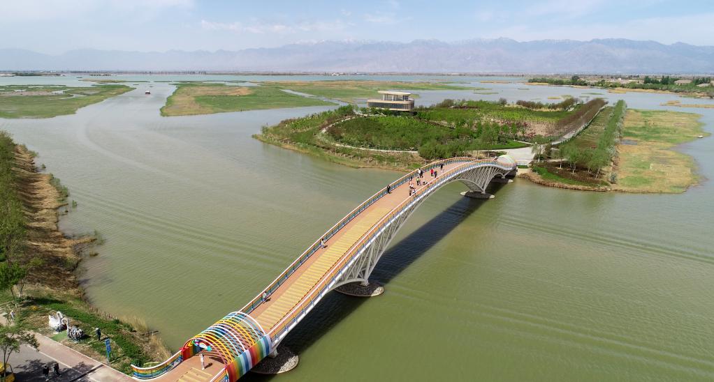 游客在沙湖景區湖東濕地游玩(無人機照片,4月30日攝)。新華社記者王鵬攝