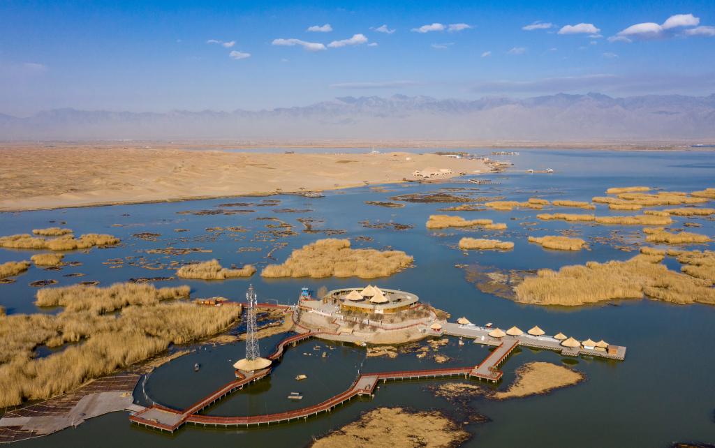 這是4月1日拍攝的沙湖鳥島觀光區(無人機照片)。新華社記者馮開華攝