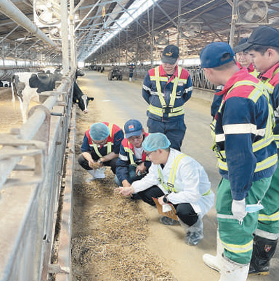 全國(guó)人大代表、內(nèi)蒙古蒙牛乳業(yè)(集團(tuán))股份有限公司研發(fā)創(chuàng)新部研發(fā)總監(jiān)史玉東(前排左三)在當(dāng)?shù)啬膛pB(yǎng)殖場(chǎng)調(diào)研。全國(guó)人大常委會(huì)辦公廳聯(lián)絡(luò)局供圖
