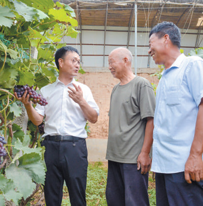 全國(guó)人大代表、河南省輝縣市張村鄉(xiāng)裴寨村黨支部書記、村委會(huì)主任裴春亮(左一)和鄉(xiāng)親們?cè)谄咸褕@查看葡萄生長(zhǎng)情況。全國(guó)人大常委會(huì)辦公廳聯(lián)絡(luò)局供圖