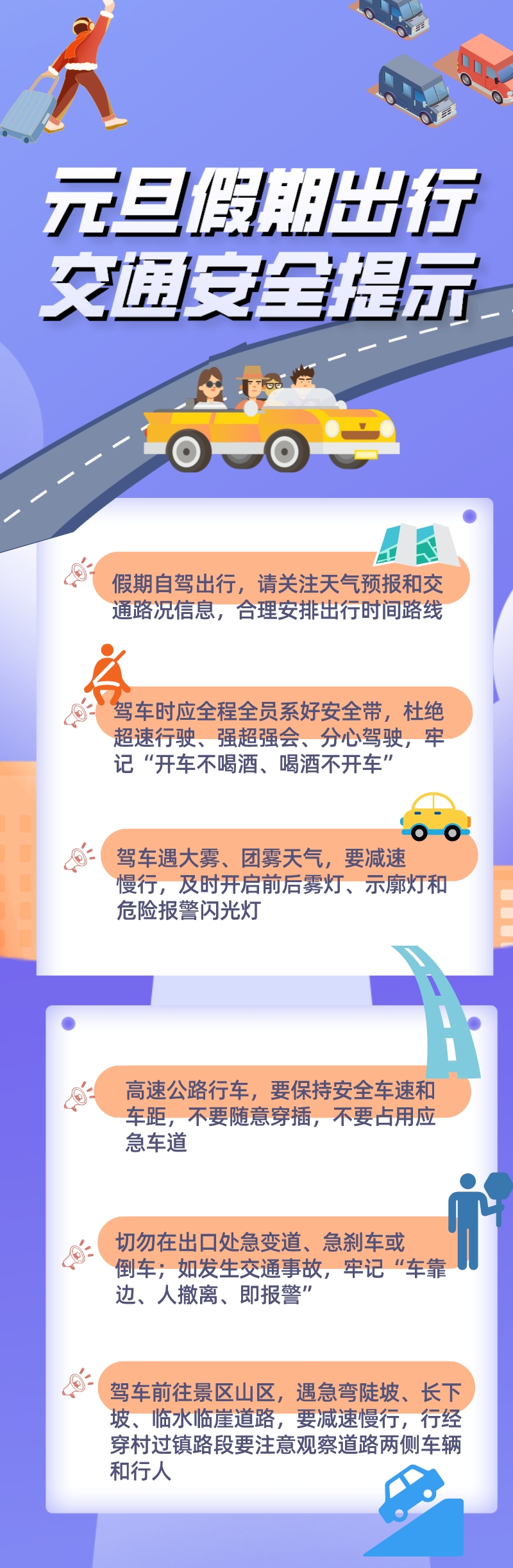 公安部結合近三年元旦假期道路交通出行和交通事故規律特點,分析研判2024年元旦假期道路交通安全形勢。據研判,元旦假期旅游客運安全風險突出,跨年賀歲活動多,溫泉游、滑雪游、農家樂等旅游出行頻繁,多家在線旅游平臺元旦假期旅游訂單量同比增長超3倍,旅游客運、公路客運、自駕車超員載客、超速行駛等違法肇事易發多發。