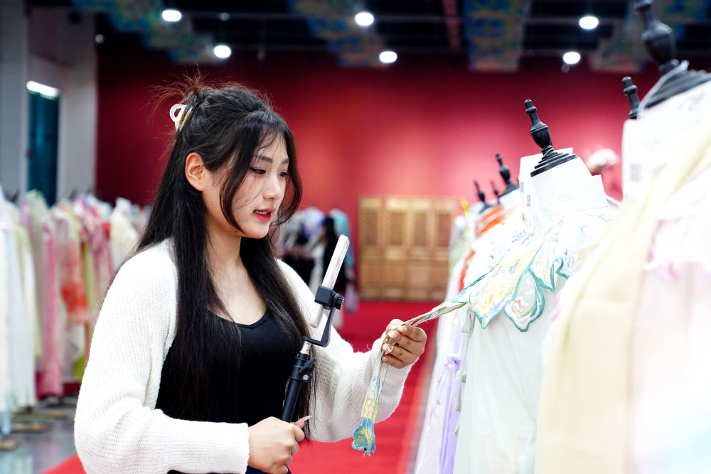 2024年4月13日,主播在山東省菏澤市曹縣有愛云倉漢服基地直播推介漢服。新華社記者 郭緒雷 攝