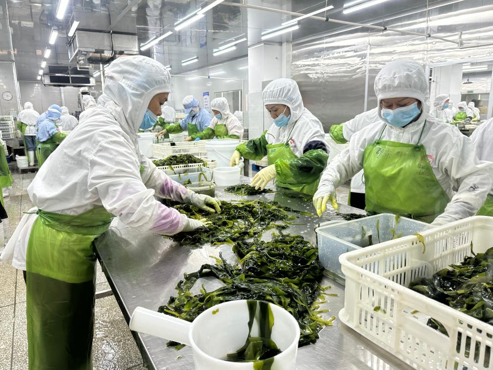 在福建省連江縣的福建億達食品有限公司,工人在分揀海帶。新華社記者 龐夢霞 攝