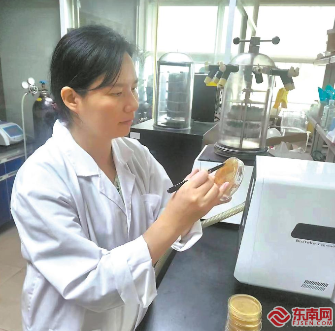 福建省農科院農產品加工研究所副研究員官雪芳正在進行活菌計數。