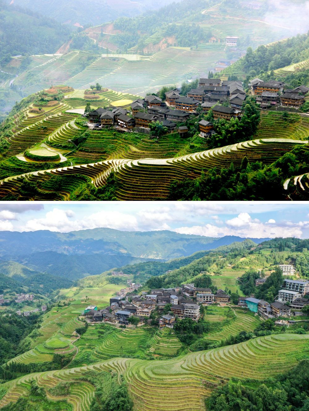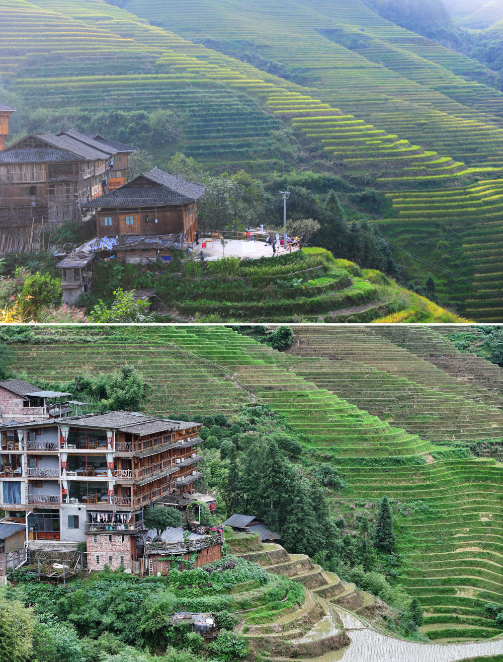 拼版照片:這是2013年(上圖,資料照片)和2024年拍攝的大寨村民宿和梯田(下圖,新華社記者曹祎銘攝)。從照片里可以看到,雖然民宿數(shù)量有一定變化,但整體的建筑風(fēng)格仍保持統(tǒng)一。