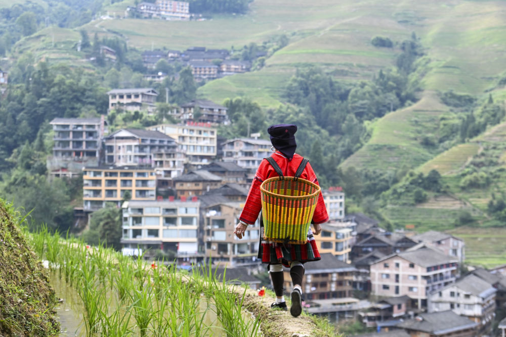 7月10日,一位瑤族村民行走在大寨村的梯田里。