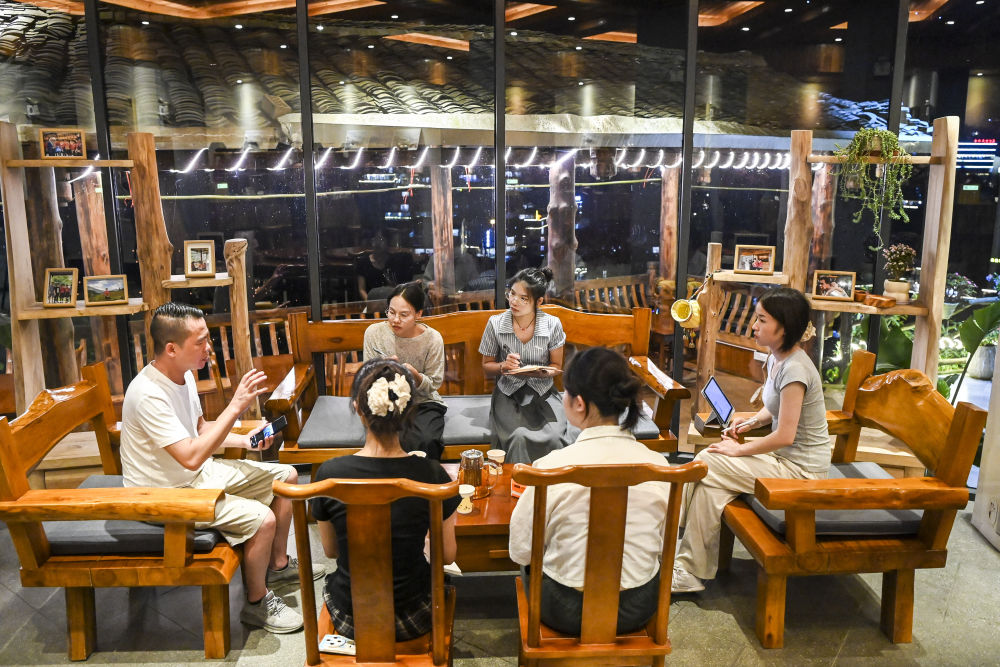 7月10日,在大寨村“山中已千年”觀景民宿,民宿負(fù)責(zé)人余瓊通(左一)與今年剛招聘來的大學(xué)畢業(yè)生交流。