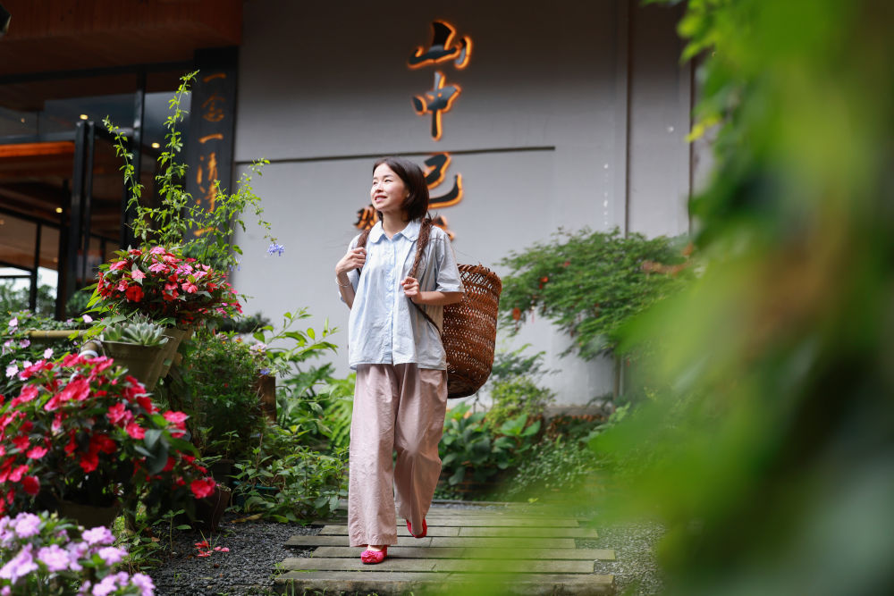在大寨村“山中已千年”觀景民宿,一名來應(yīng)聘的大學(xué)生背著筐外出(6月26日攝)。