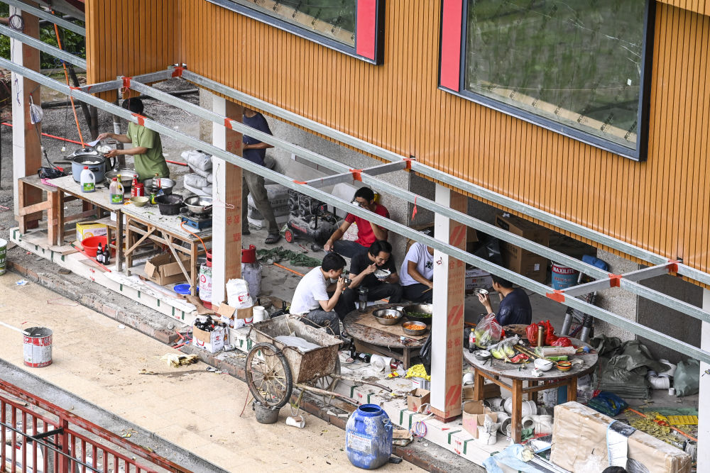 在大寨村一處建設(shè)中的民宿施工現(xiàn)場(chǎng),工人們聚在一起吃午飯(6月26日攝)。