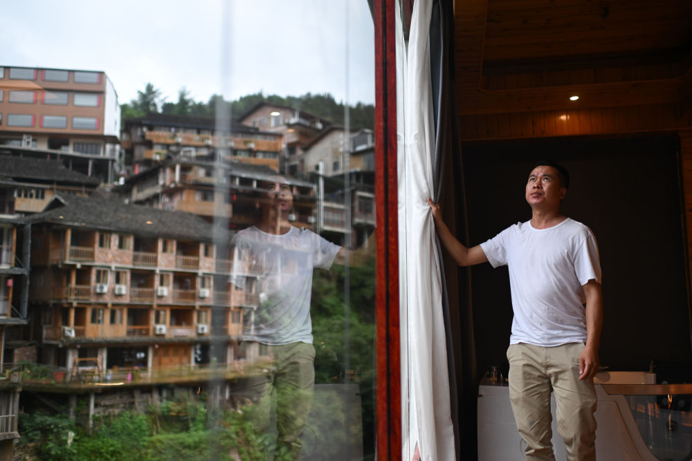 大寨村“山中已千年”觀景民宿負(fù)責(zé)人余瓊通整理客房窗簾(6月26日攝)。